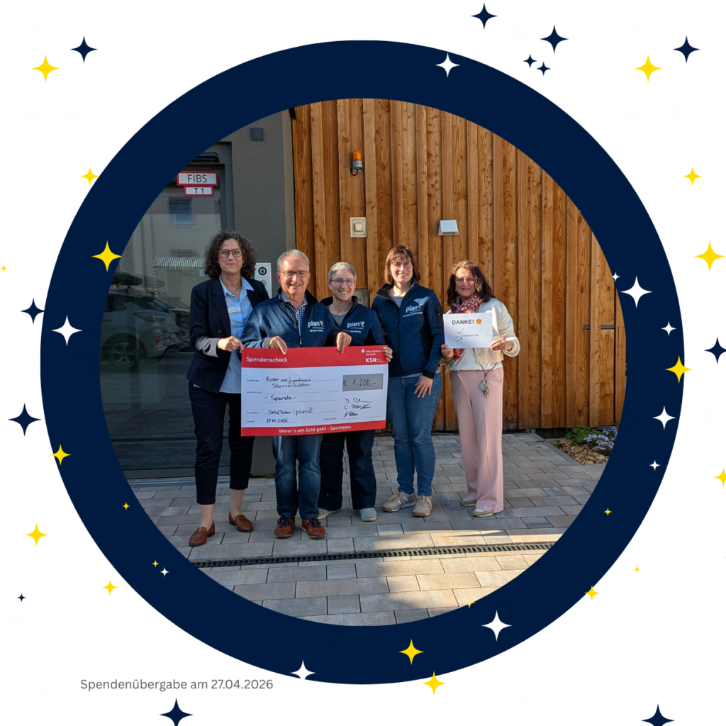 Am 27. April 2026 durften wir das Ergebnis unseres gemeinsamen Engagements persönlich übergeben. Im Gespräch mit Nicole Zimmer (Geschäftsführung Sternenlichter) und Gabriele Pfahlert wurde einmal mehr deutlich, wie viel diese Unterstützung bewirkt. Wir freuen uns sehr, dass wir als Team von planZ einen Beitrag dazu leisten können, dass diese unverzichtbare Arbeit fortgesetzt werden kann.